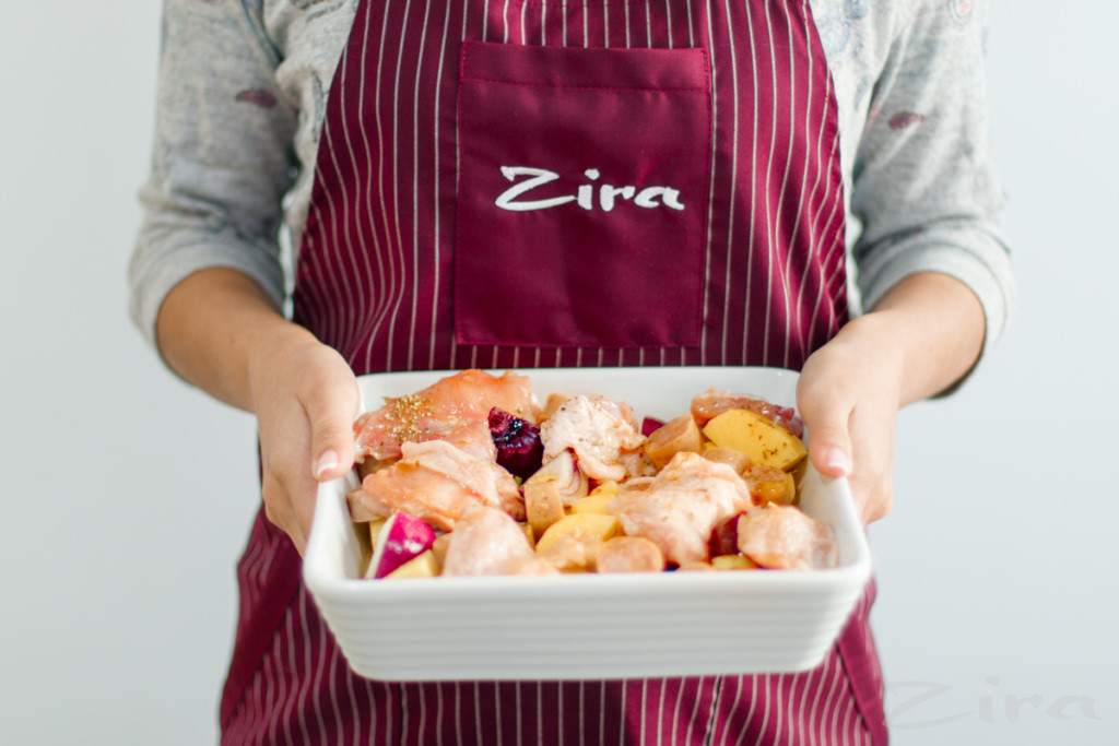 Сочные колбаски, красный лук, апельсиновый сок — все это гармонично дополняет привычный картофель с курицей.