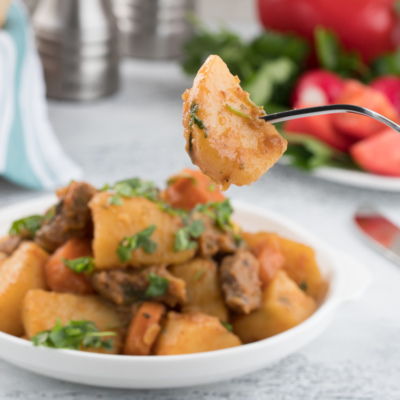Kartoshkani solamiz, aralashtiramiz, ozroq tuz sepamiz, kashnichning poyachalarini to'g'rab solamiz, 300 ml. qaynoq suvni quyamiz, aralashtirib, qopqog'ini yopamiz, olovni o'rtacha qilib, kartoshka pishguniga qadar, taxminan, 20-30 daqiqa davomida pishiramiz.