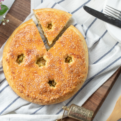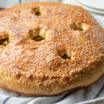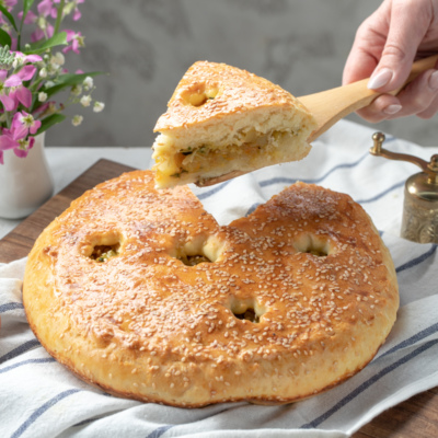 Тщательно подвернуть края внутрь и закрепить. По центру сделать дырочку для выхода пара. Смазать пирог чайной ложкой сметаны или яйцом, посыпать кунжутом.