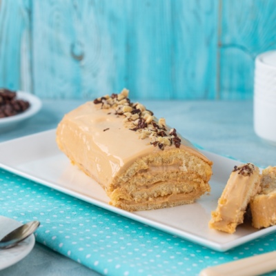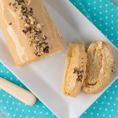 Покрыть поверхность рулета оставшимся кремом. Посыпать измельченными орехами.