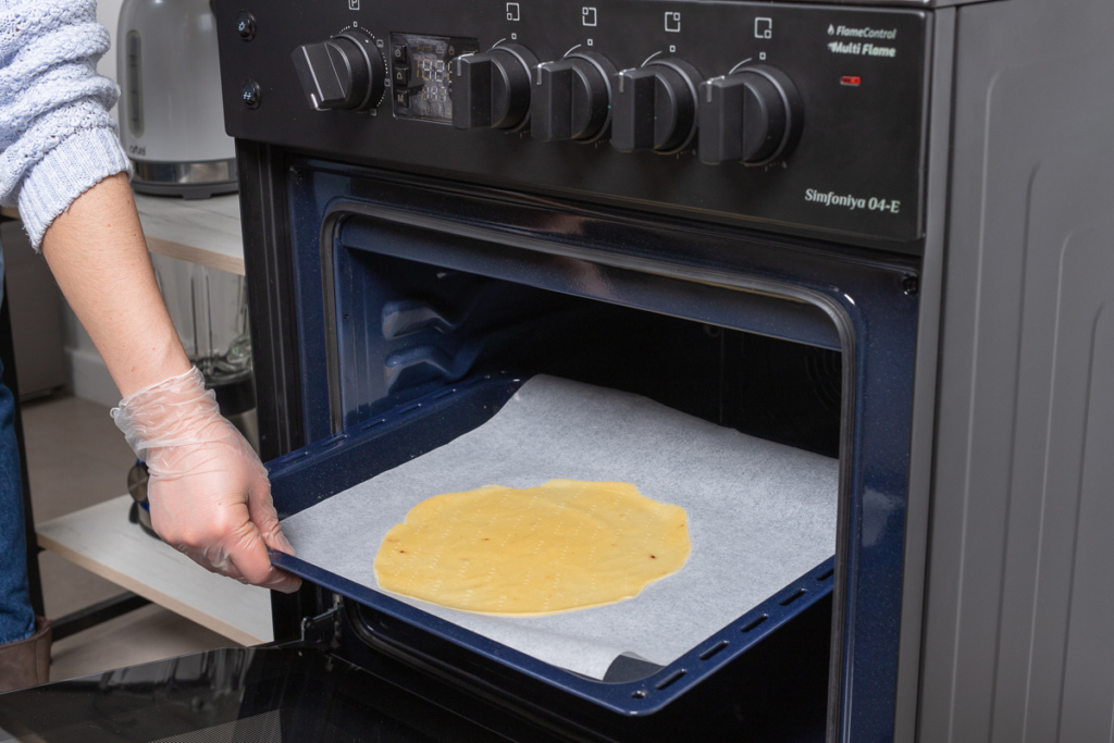 Xamir yaxshi pishishi uchun, uni sanchqi yordamida teshib chiqamiz.