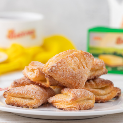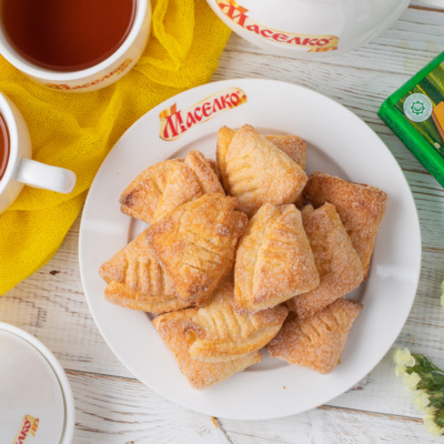 Каждый круг теста окунуть в сахар с одной стороны, сложить пополам сахаром внутрь. Снова окунуть половинку кружка в сахар и снова сложить пополам. Макнуть в сахар верхней стороной. В такой же последовательности сформировать остальное тесто.