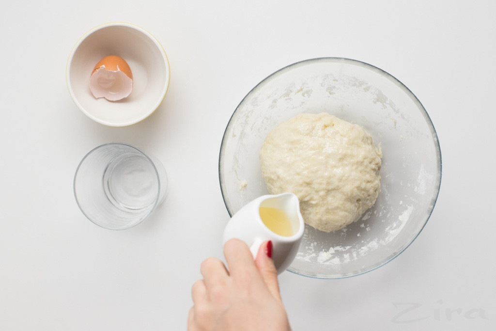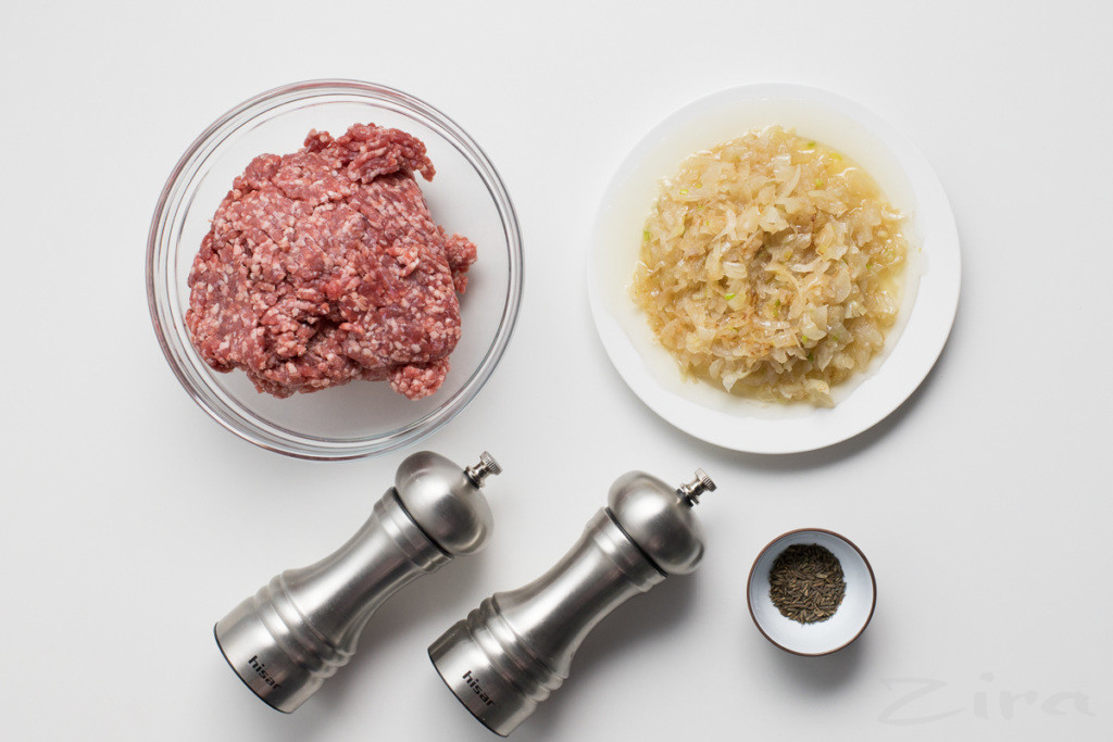 Idishga qiymani solamiz, ustidan qovurilgan piyozni solib tuz va ziravorlarni sepamiz.