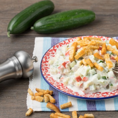 Огурцы нарезать брусочками, помидоры черри разрезать пополам и добавить к салату.