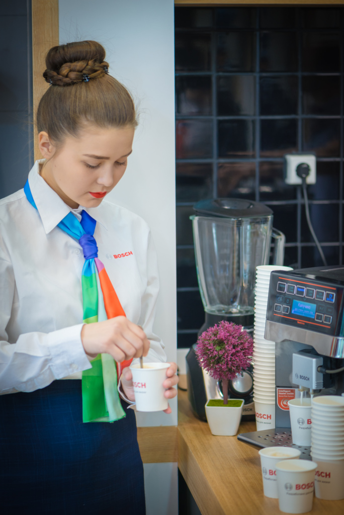 Пока шеф начал готовить ингредиенты, гости смогли насладиться чашечкой бодрящего кофе. С кофемашиной Bosch не нужно быть профессиональным баристой, чтобы приготовить любимый кофейный напиток в считанные секунды: латте, макиато, эспрессо, капучино. Модель очень технологична: достаточно засыпать кофе, нажать кнопку на дисплее, и уже через 30 секунд вы сможете пить ароматный кофе, сваренный специально для вас. При этом можно регулировать крепость напитка, объем молока, количество и объем чашек.