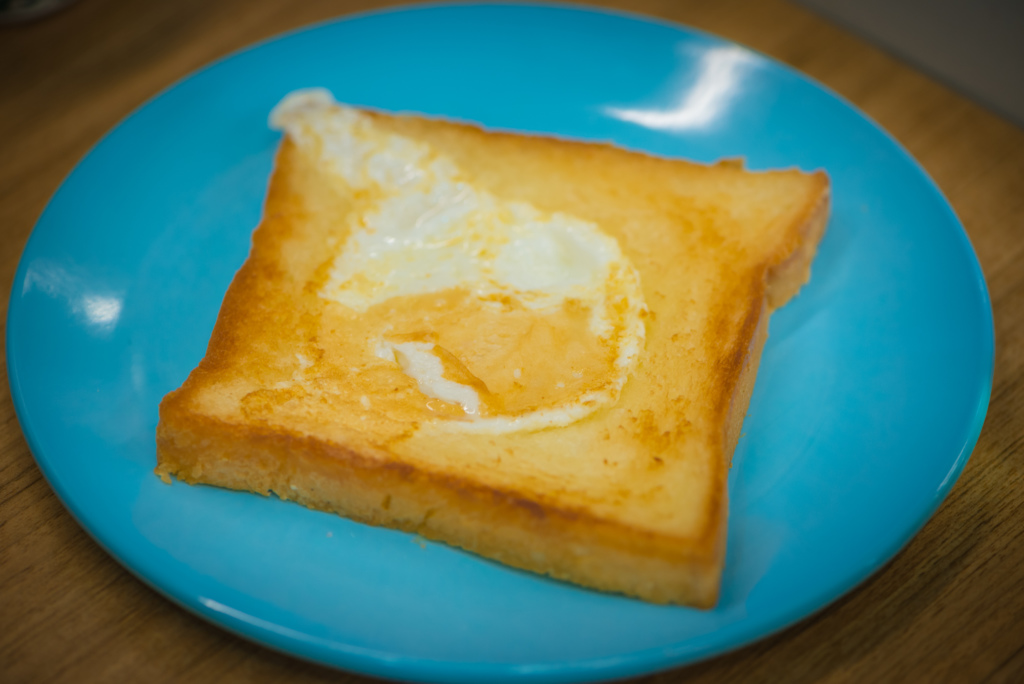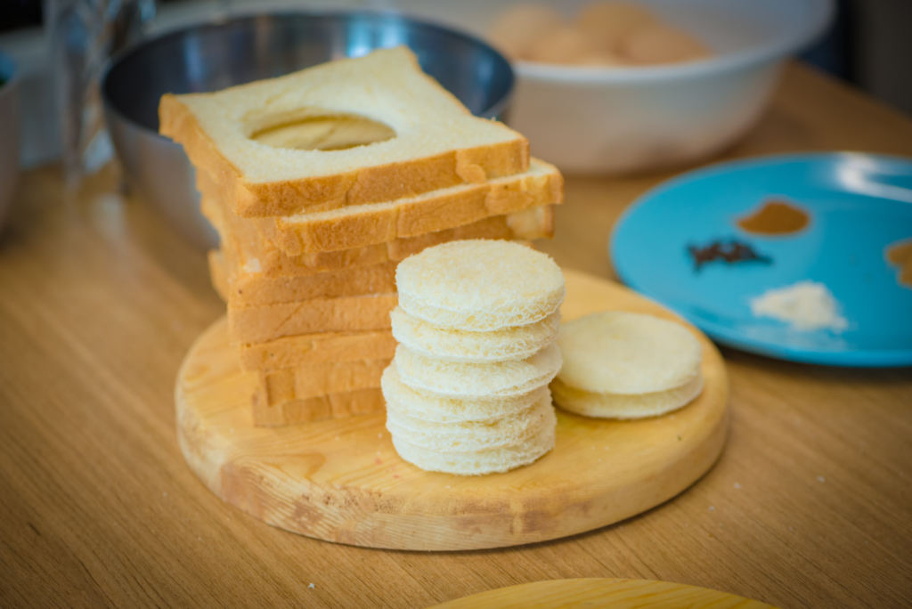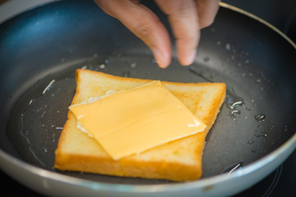 “Начнем с обычного блюда, которое многим делали мамы в детстве. Берем тостерный хлеб и при помощи стакана выдавливаем сердцевину. Мы используем ее для приготовления другого блюда. Ставим сковороду на плиту, разогреваем до средней температуры и наливаем немного масла. В получившееся отверстие заливаем яйцо и жарим до готовности. Лучше использовать антипригарную сковороду и лопатку пошире, чтобы ничего не прилипало. А потом сверху добавляем плавленный сыр и получается вкусняшка”, — продемонстрировал шеф-повар.