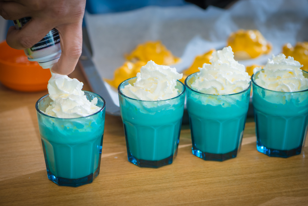 Шеф-повар продолжил приготовление безалкогольного коктейля эгг-ног: “В разогретое молоко, куда уже положили специи и пряности, мы будем добавлять взбитые желтки. Главное не доводить его до кипения и добавлять желтки постепенно, тонкой струйкой, чтобы они не свернулись. В полученную массу можно для аромата добавить выпаренный коньяк, а потом сливки. Это очень вкусно, попробуйте!”