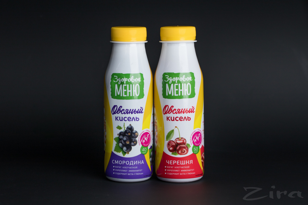 Как видно, кисель разлит в обычные пластиковые бутылочки, но сама по себе упаковка довольно интересная, привлекающая внимание, так и хочется взять из-за большого количества надписей «здоровое меню», «для веганов», «минимум калорий».