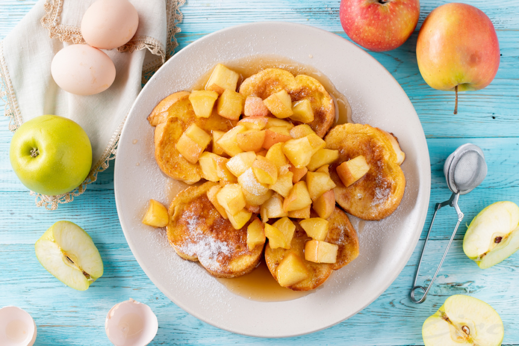 Золотистые гренки со сладкими яблоками, карамелизированными с корицей не оставят равнодушным никого. Кстати, если на еще теплые яблоки, положить шарик ванильного мороженого, то ваш заврак станет еще более оригинальным.
