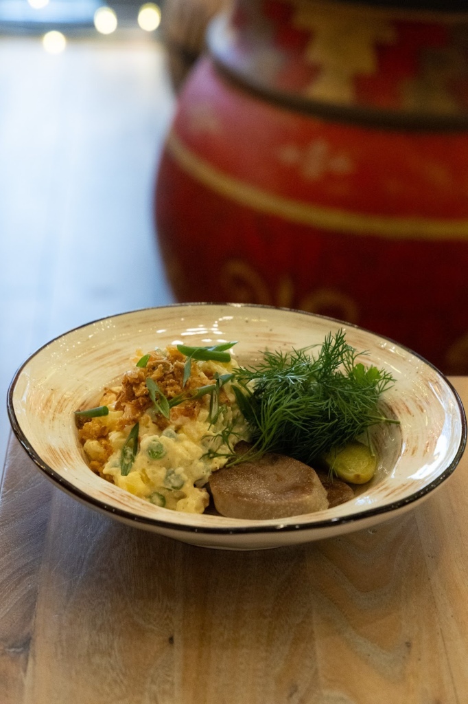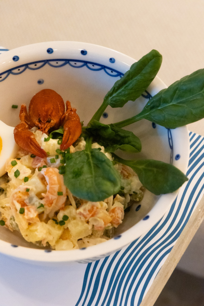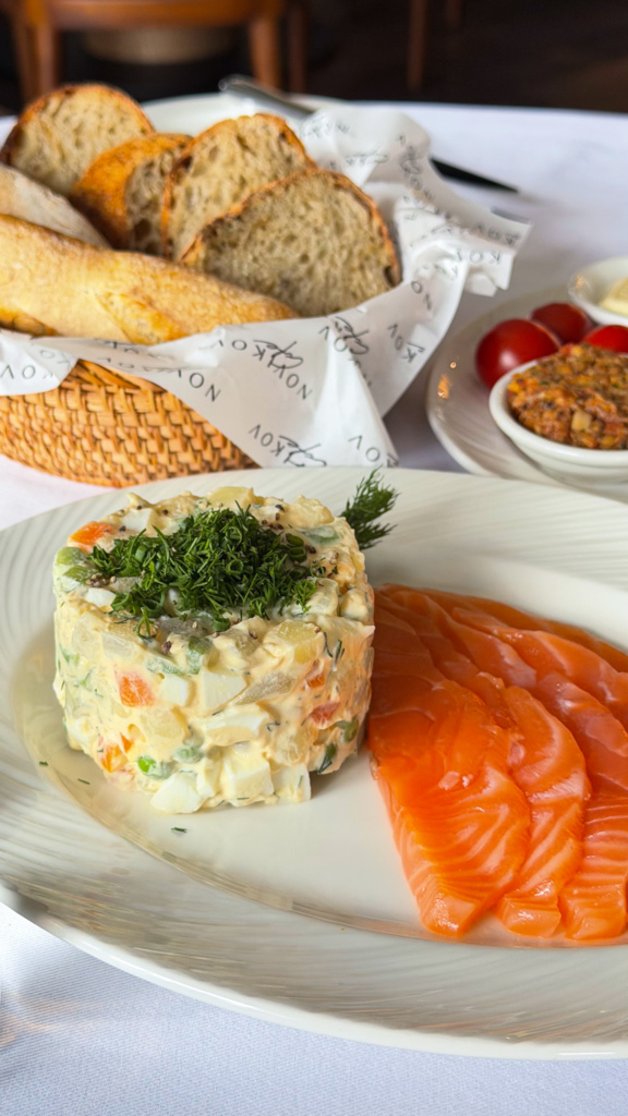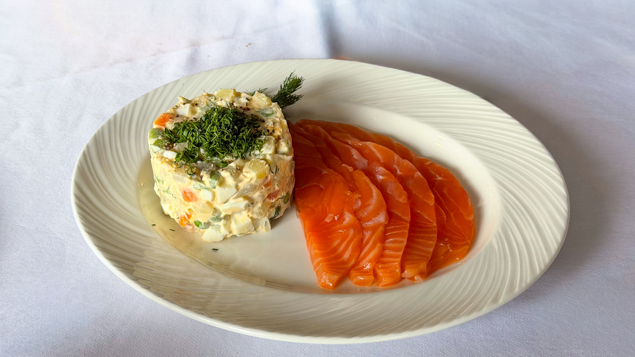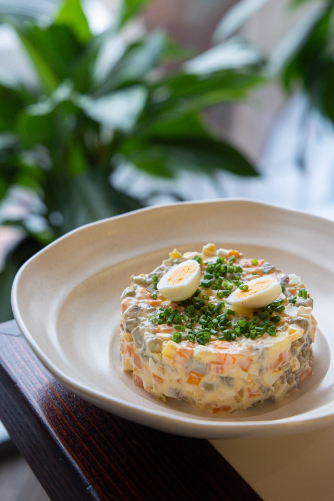 Мы не хотели, чтобы нам больше всех понравился оливье в самом дорогом заведении из нашего списка — но в итоге так и вышло. Салат сформирован в аккуратную шайбу. Рядом подают щедрую порцию наисвежайшего слабосоленого лосося. Горошек свежий, не консервированный. Заправка легкая. Перед подачей салат посыпают черным перцем крупного помола. Ингредиенты отлично дополняют друг друга, а лосось делает вкус ярче, показывая, что даже обычное оливье можно подать с утонченностью.