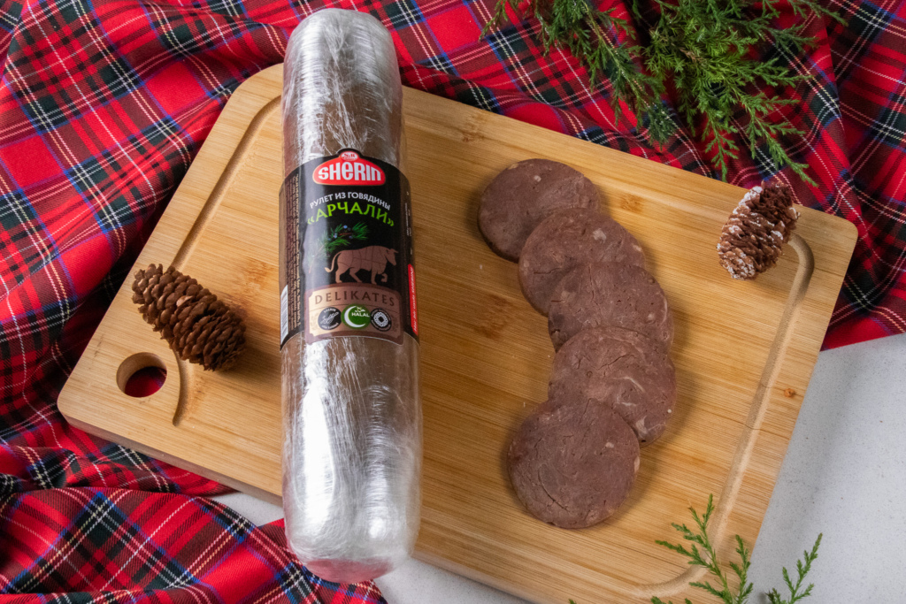 В самом названии «Арчали» уже чувствуется настроение Нового года. Этот деликатес отличает выразительный аромат с нотками копчения на еловых веточках и яркий вкус высокосортного мяса. Рулет из говядины «Арчали» словно создан для зимнего стола.