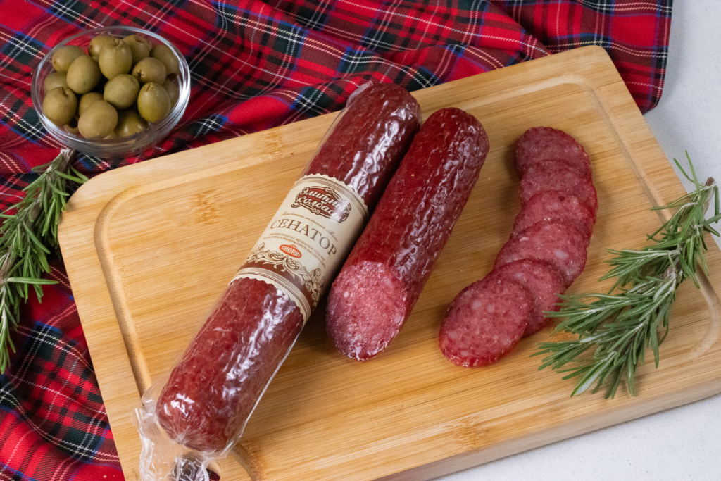 Колбаса «Сенатор» завершает праздничную мясную нарезку. У нее ровный рисунок, правильная плотность и незабываемый вкус. «Сенатор» легко вписывается в новогодний стол: и в нарезку, и в закуски.