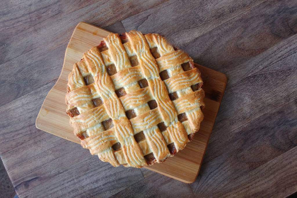Раскатать оставшееся тесто в пласт, нарезать полоски и украсить ими верх пирога, как на фото.