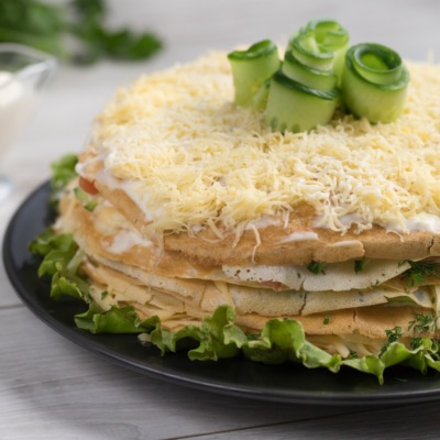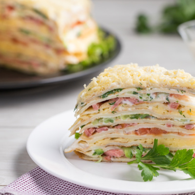 Блинный торт с ветчиной, сыром и овощами