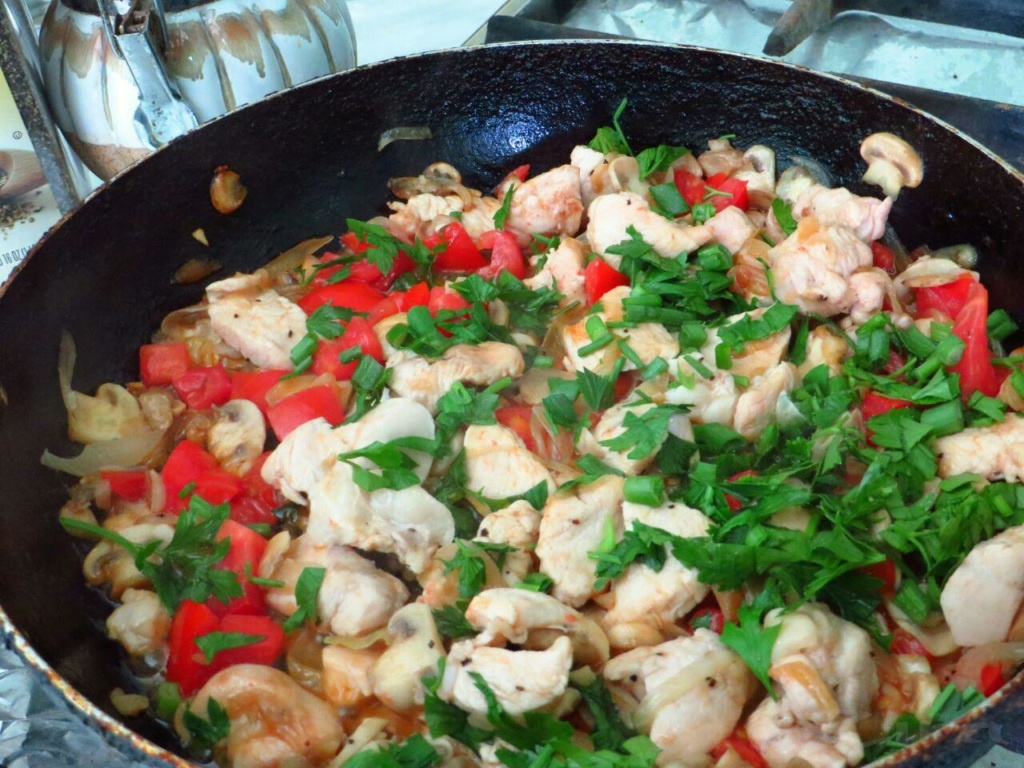 Куриную грудку нарезать на средние кубики и обжарить с луком до готовности.