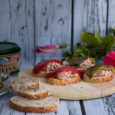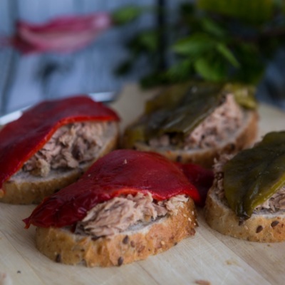 Брускетта с тунцом и запеченным сладким перцем на ржаном хлебе