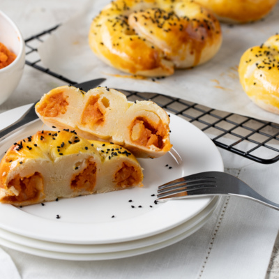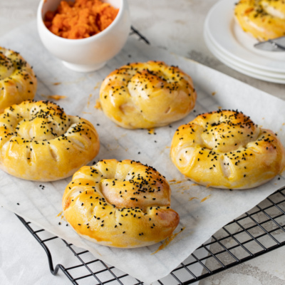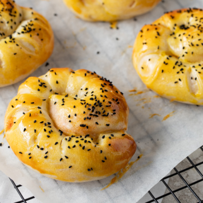 Переложить булочки на противень застеленный пергаментом. Смазать яйцом и посыпать черным кунжутом.