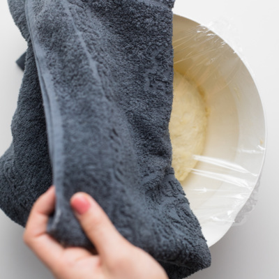 Тесто накрыть салфеткой и поставить подниматься в теплое место на 2 часа.
