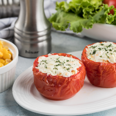 Фаршированные помидоры выпекать при температуре 180 С 20 минут. Затем посыпать помидоры тертым сыром и выпекать еще несколько минут до расплавления сыра.