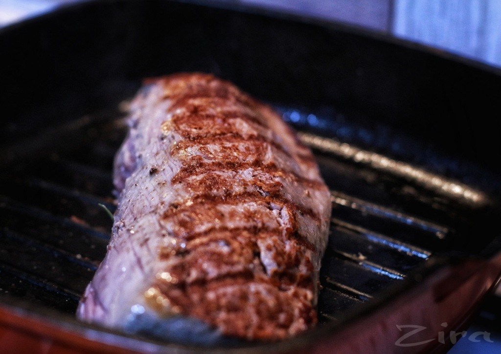 Вырезку очистить от жира и пленок. Посолить, поперчить и обжарить на раскаленной сковороде по 2 минуты с каждой стороны.