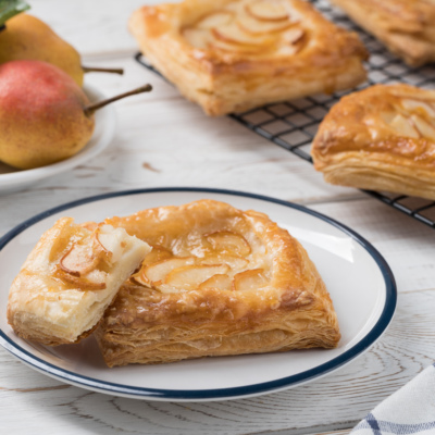 Переложить тесто на противень. Груши нарезать тонкими ломтиками и выложить в середину квадрата.