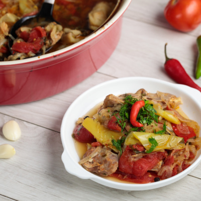 Добрый день! Можно тушить в казане на плите или в форме для запекания, примерно при 170 С в духовке.