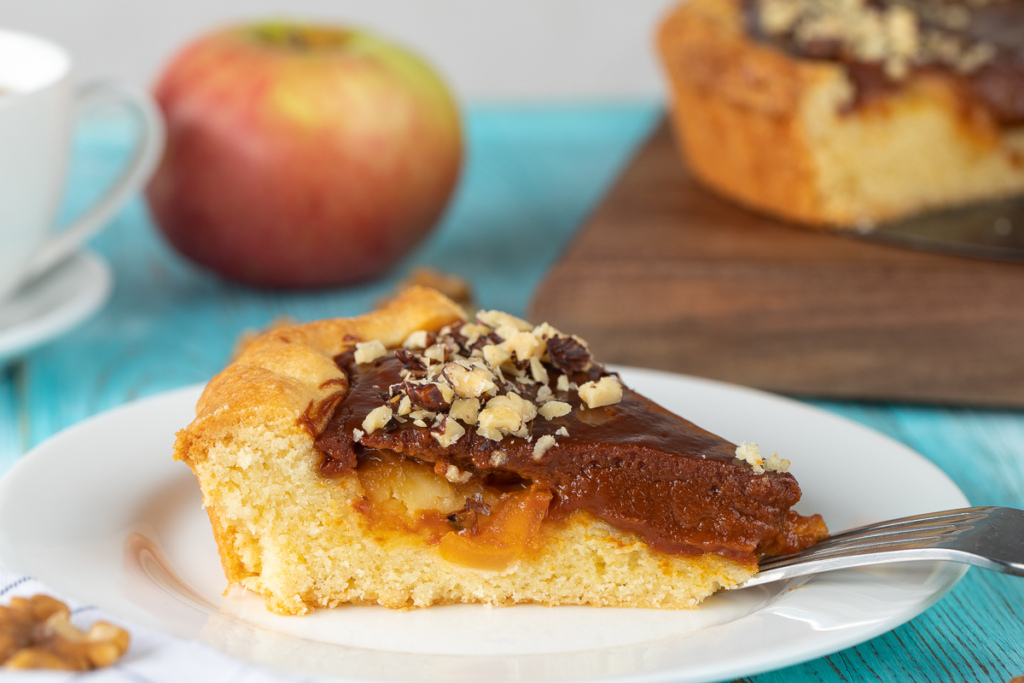 Рекомендуем испечь этот пирог тем, кто любит выпечку с яблоками. Нежное песочное тесто, начинка из яблок и карамельная заливка — этот пирог покорит вас своим вкусом.