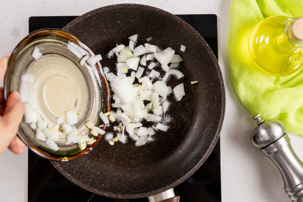 Лук очистить и нарезать мелкими кубиками. Чеснок очистить и мелко порубить.