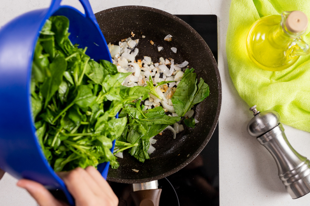 Шпинат перебрать и удалить грубые стебли. Листья вымыть, обсушить и крупно нарезать.