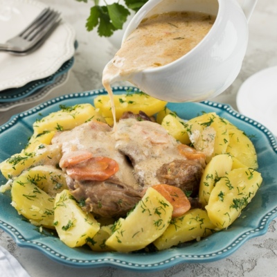 Когда мясо станет мягким, добавить сметану, соль и перец по вкусу.