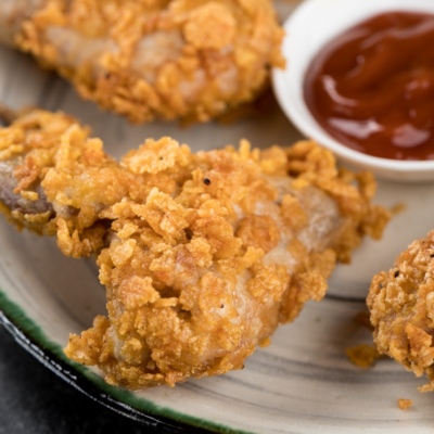 Обвалять крылышки в муке, затем в яичной смеси и кукурузной крошке.