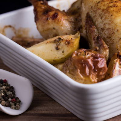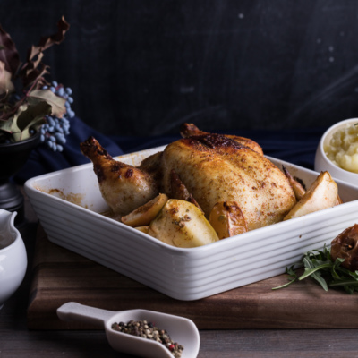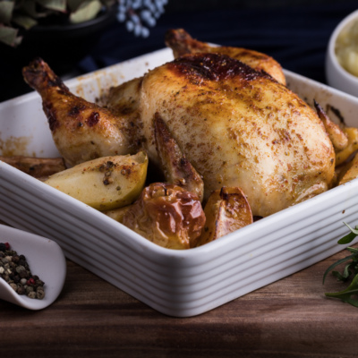 Приготовленная по этому рецепту запеченная целиком курица получается очень нежной, с аппетитной хрустящей корочкой, а лимоны и яблоки придают мясу неповторимый аромат.