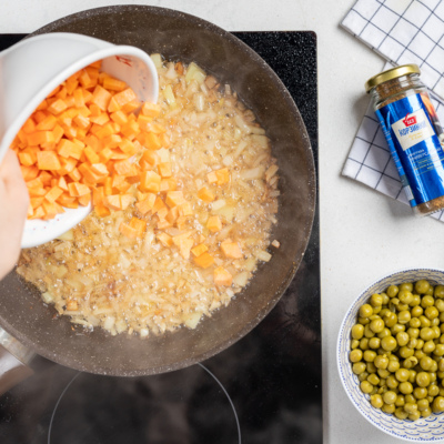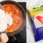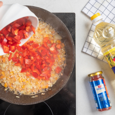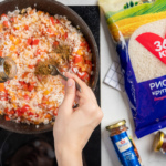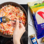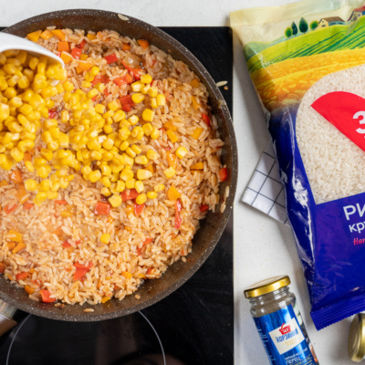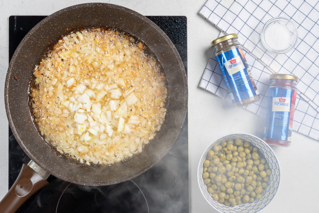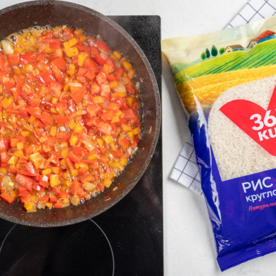 Непрерывно помешивая, обжарить овощи с рисом 2 минуты.