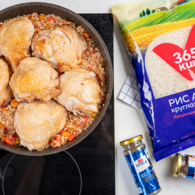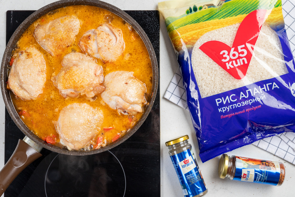 Снова накрыть сковороду крышкой и готовить блюдо на небольшом огне ещё минут 10, до полной готовности риса. Куриные бёдра к этому моменту также будут готовы.