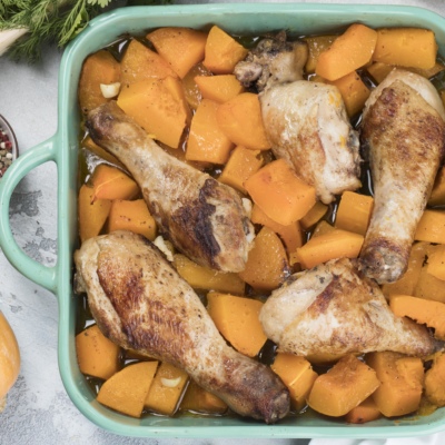 С тыквой лучше всего запекать куриные голени или бедрышки, горчицу можно использовать французскую в зернах. По желанию можете дополнить рецепт картофелем, нарезанным на крупные дольки.