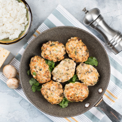 Из куриного мяса получаются очень нежные и вкусные котлеты. Если к мясу добавить грибы и сыр, то котлеты из обычного блюда за 5 минут превратятся в праздничные.