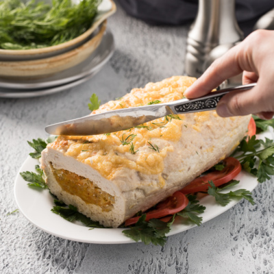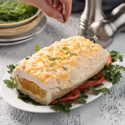 Для этого рулета мы использовали куриный фарш, но также прекрасно подойдет фарш из индейки.