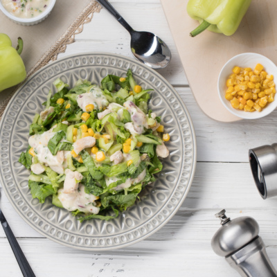Салат с курицей, кукурузой и яйцами — простой, но очень аппетитный. Заправка с красным и зеленым луком придаст салату пикантности и особый аромат.