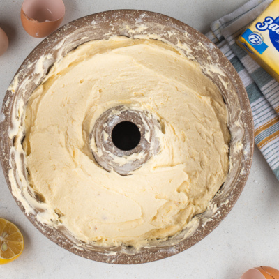 Добавить муку, смешать. Тесто для лимонного кекса выложить в форму.