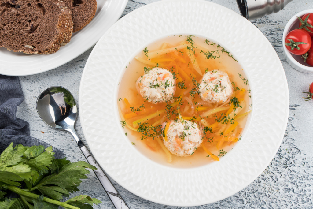 Лёгкий суп с фрикадельками и лапшой из кабачков
