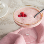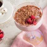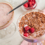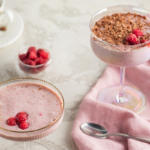 Затем переложить в чашу замороженный банан, малину, налить молоко и перемешать с помощью блендера.