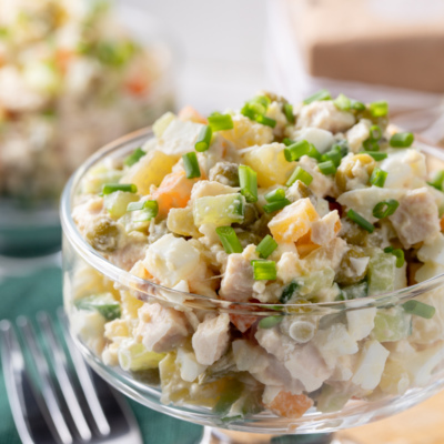 Оливье по этому рецепту действительно можно есть «тазиками». Оно содержит гораздо меньше калорий, чем приготовленное по классическому рецепту.