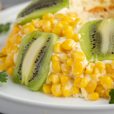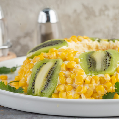Украсить салат с кукурузой и киви. Аккуратно вынуть из центра салата форму и подавать к столу.