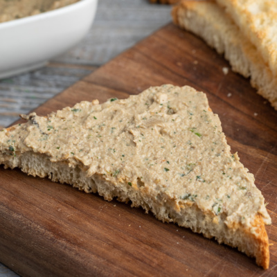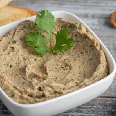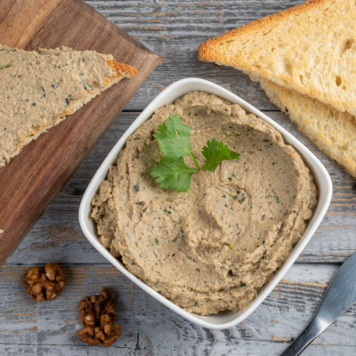 Рецепт питательного и сытного паштета из запечённого баклажана с добавлением чеснока, грецких орехов и зелени, который готовится быстро и просто.