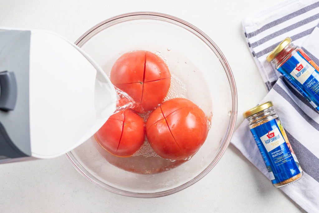 Помидоры хорошо вымыть под холодной проточной водой, высушить. На каждом помидоре необходимо сделать крестообразный надрез.