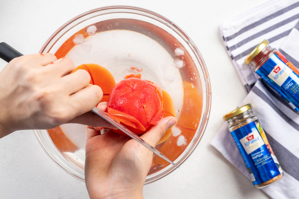 Затем помидоры полностью залить кипятком и оставить на 1 минуту. Далее помидоры сразу же переложить в холодную воду с кусочками льда. Кожица легко снимется в направлении к черешку. В последнюю очередь вырезать место черешка.