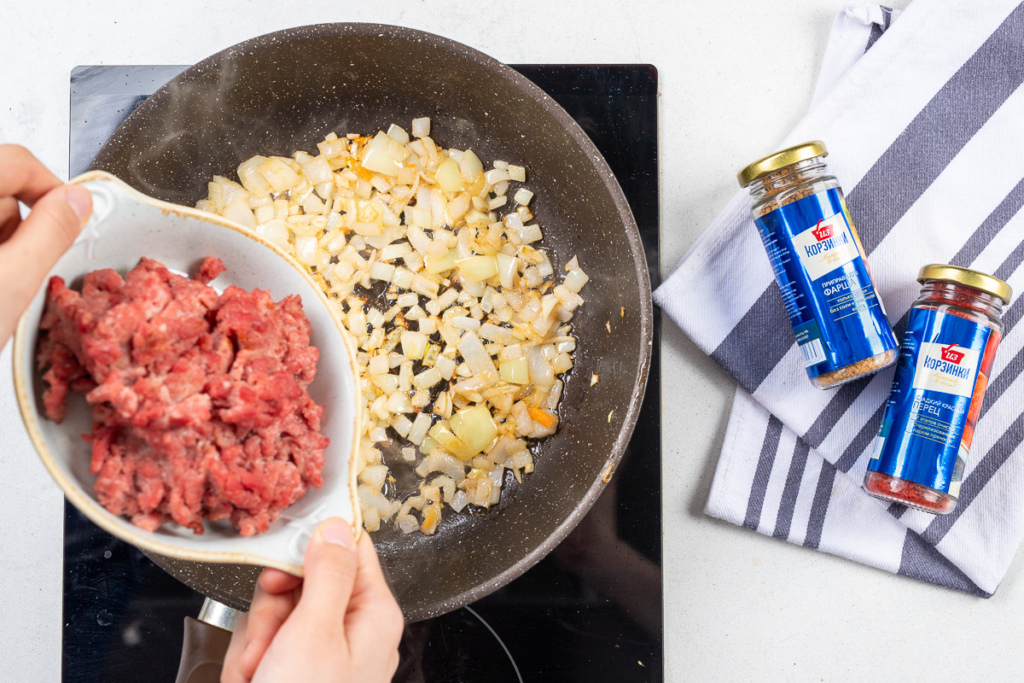 Затем к луку с чесноком добавить фарш и, помешивая вилкой (чтобы не образовывались комочки), жарить на среднем огне в течение 5-6 минут.