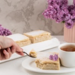 Второй пласт теста нарезать сразу на нужное количество кусочков и выложить на крем. После охлаждения будет удобно нарезать пирожные уже по готовому контуру.