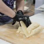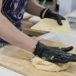 Теперь это жидкое тесто нужно "отбить", чтобы убрать лишний воздух из теста. На доску или другую плоскую поверхность, присыпанную мукой, одной рукой бросаем шар теста, и плавным движением той же рукой собираем шар обратно. И повторяем так много раз. Дальше берем кондитерский шпатель-трапецию, и “рвем” тесто - хаотичными движениями делим тесто на небольшие куски. Затем собираем обратно в ком и бросаем. Так повторяем много раз. В процессе тесто заметно уплотняется и меняется по консистенции. Становится более податливым и однородным.