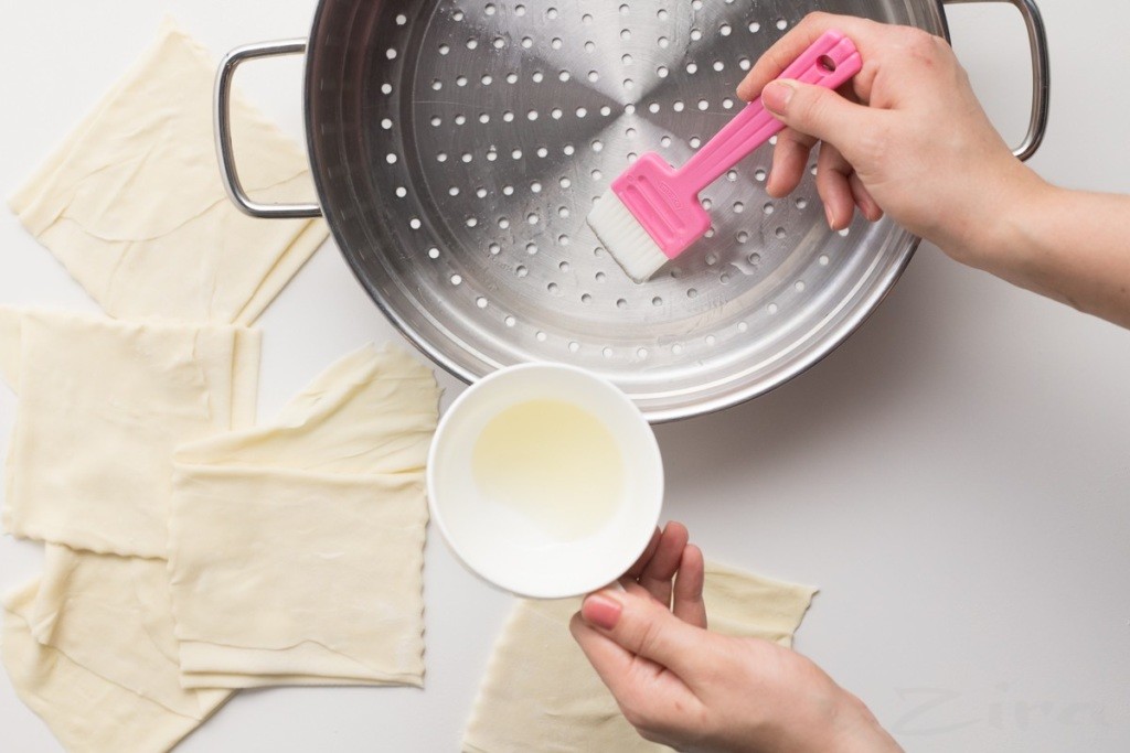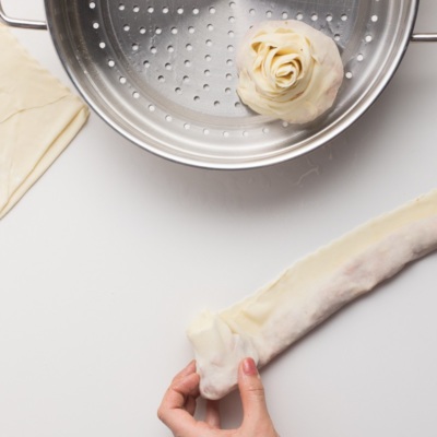 Отдохнувшее тесто очень тонко раскатать с помощью длинной скалки.